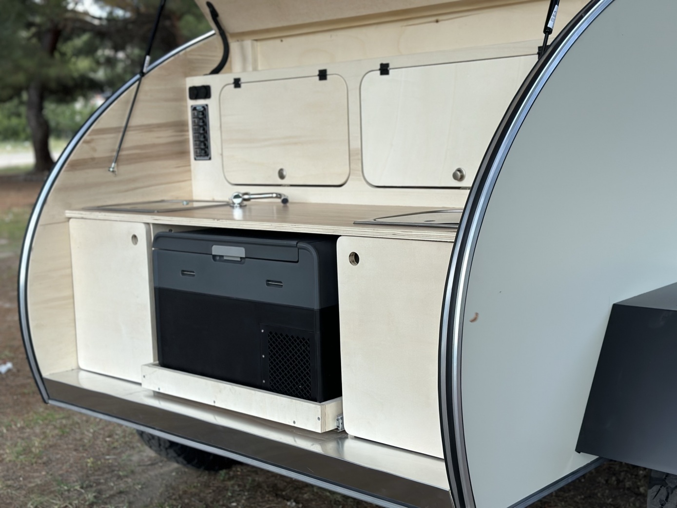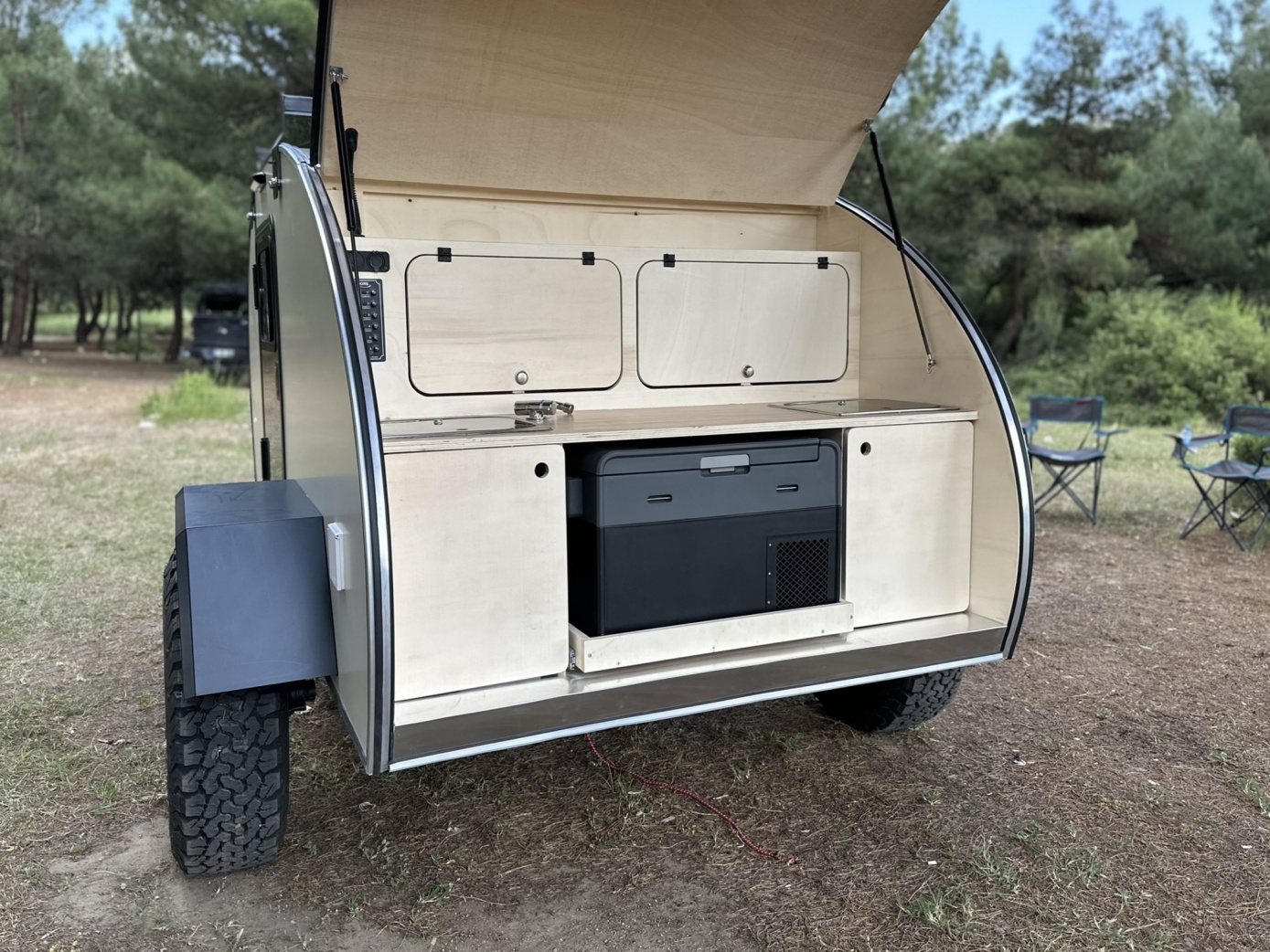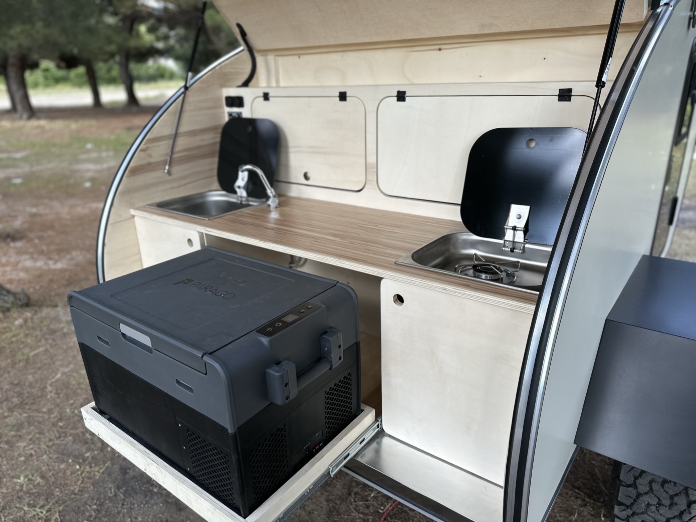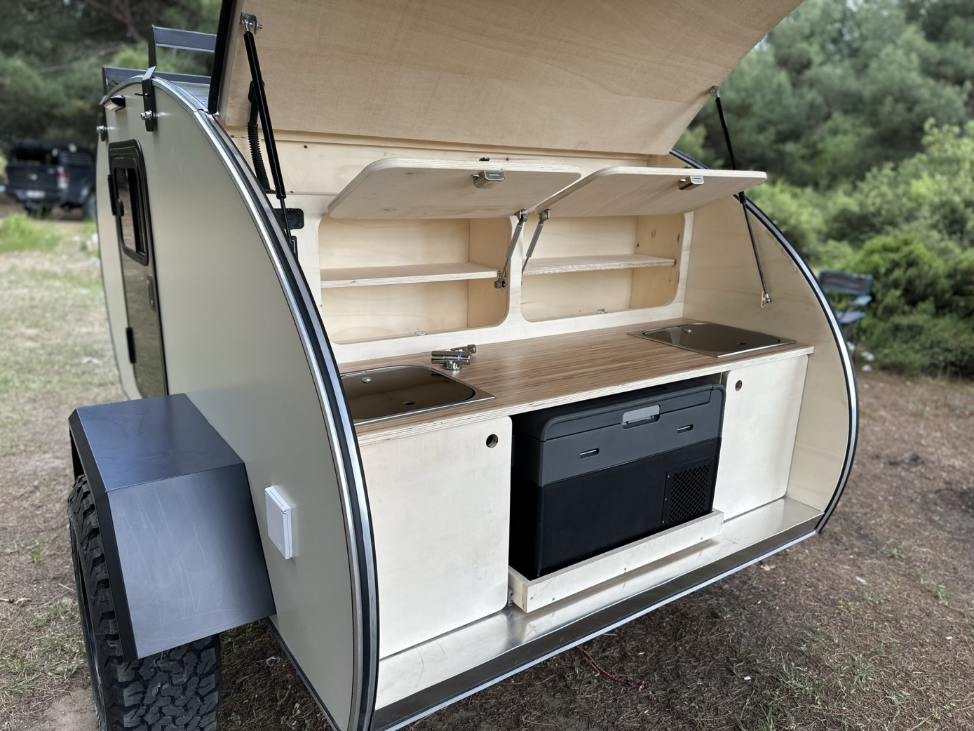 ve tatsız kamp yemeklerini evde bırakın ve lavabo, musluk, LED aydınlatma, ocak ve 12V soğutucu